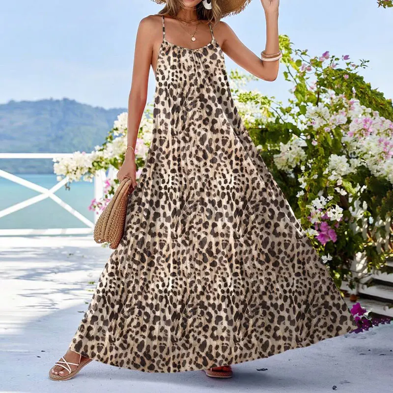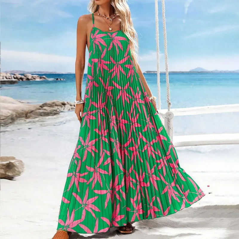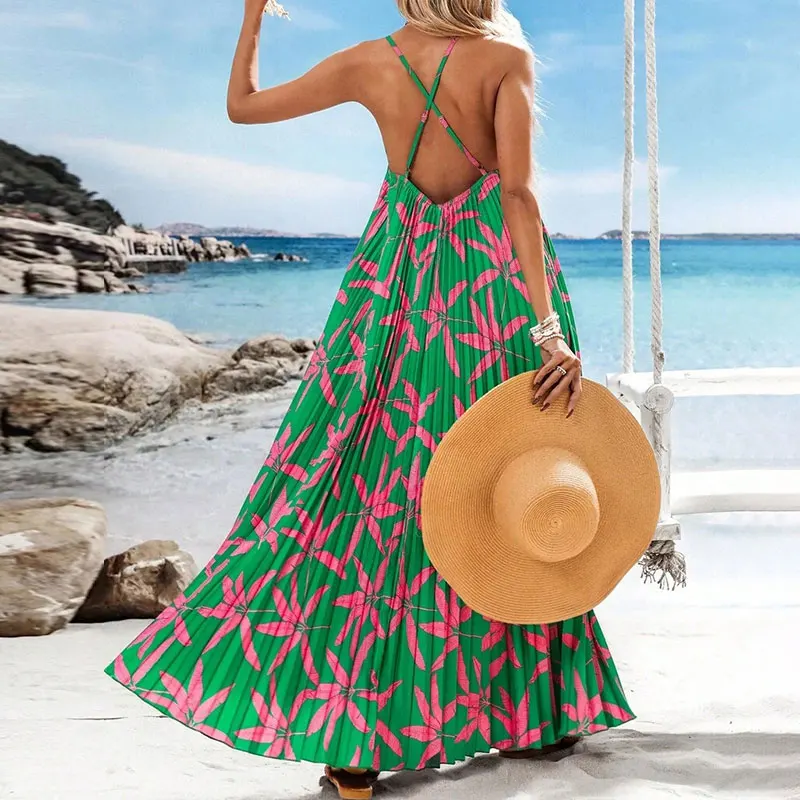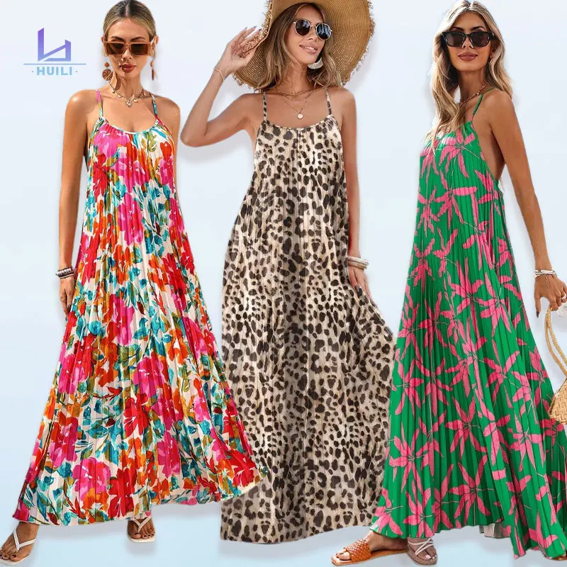 Huili Manufacturer Oem Women Holiday Hawaiian Strappy Backless Loose Ruffle Hem Oversized Maxi Dress Custom Floral Print